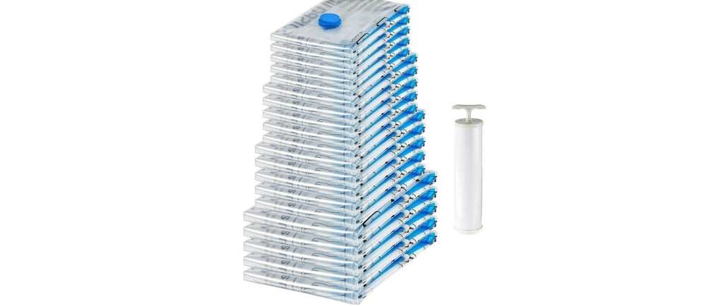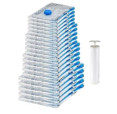 Maximize your storage space with ease. These clear, multi-size vacuum bags with a convenient hand pump keep clothes, bedding, and travel essentials neatly packed, protected, and up to 80% smaller in size.